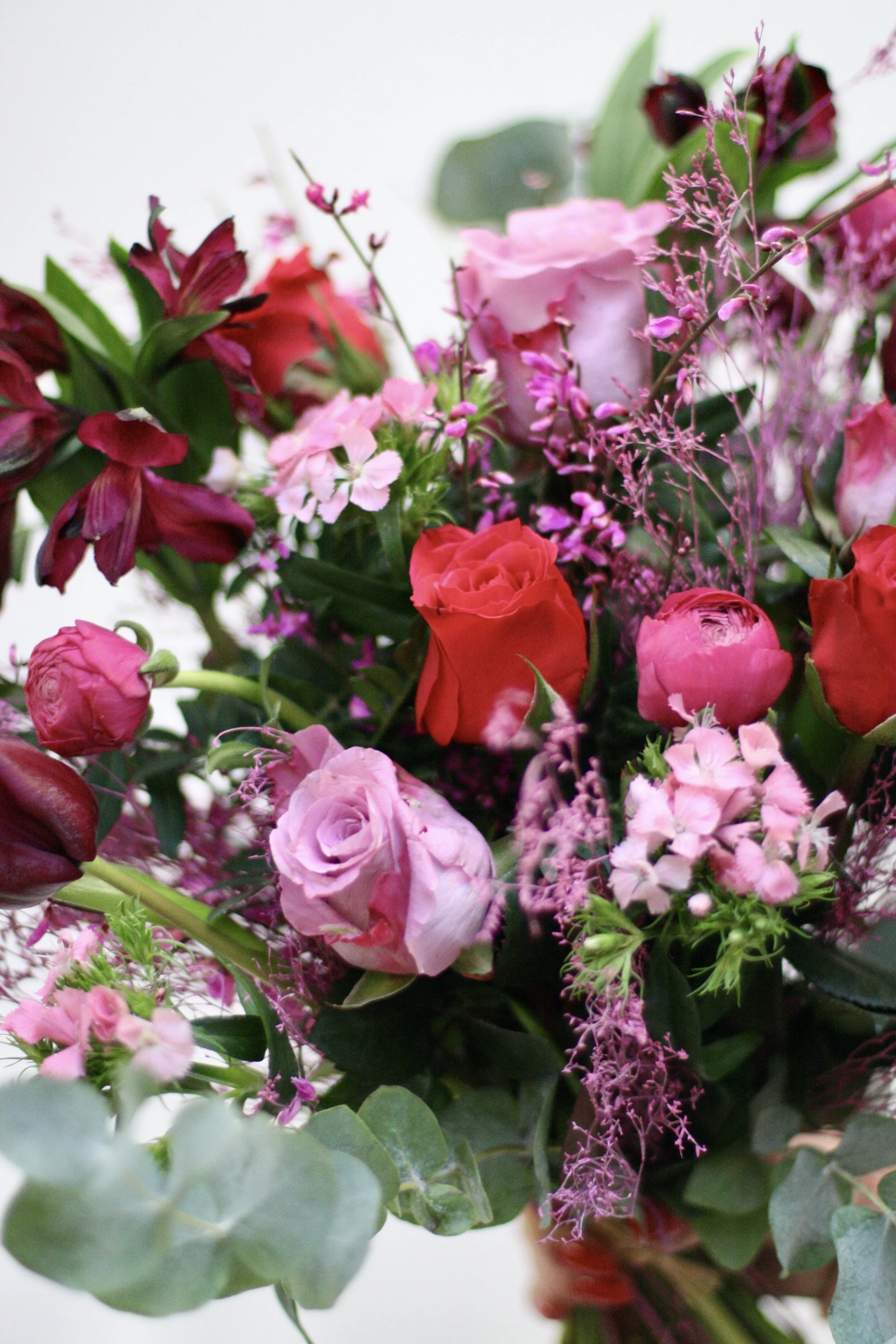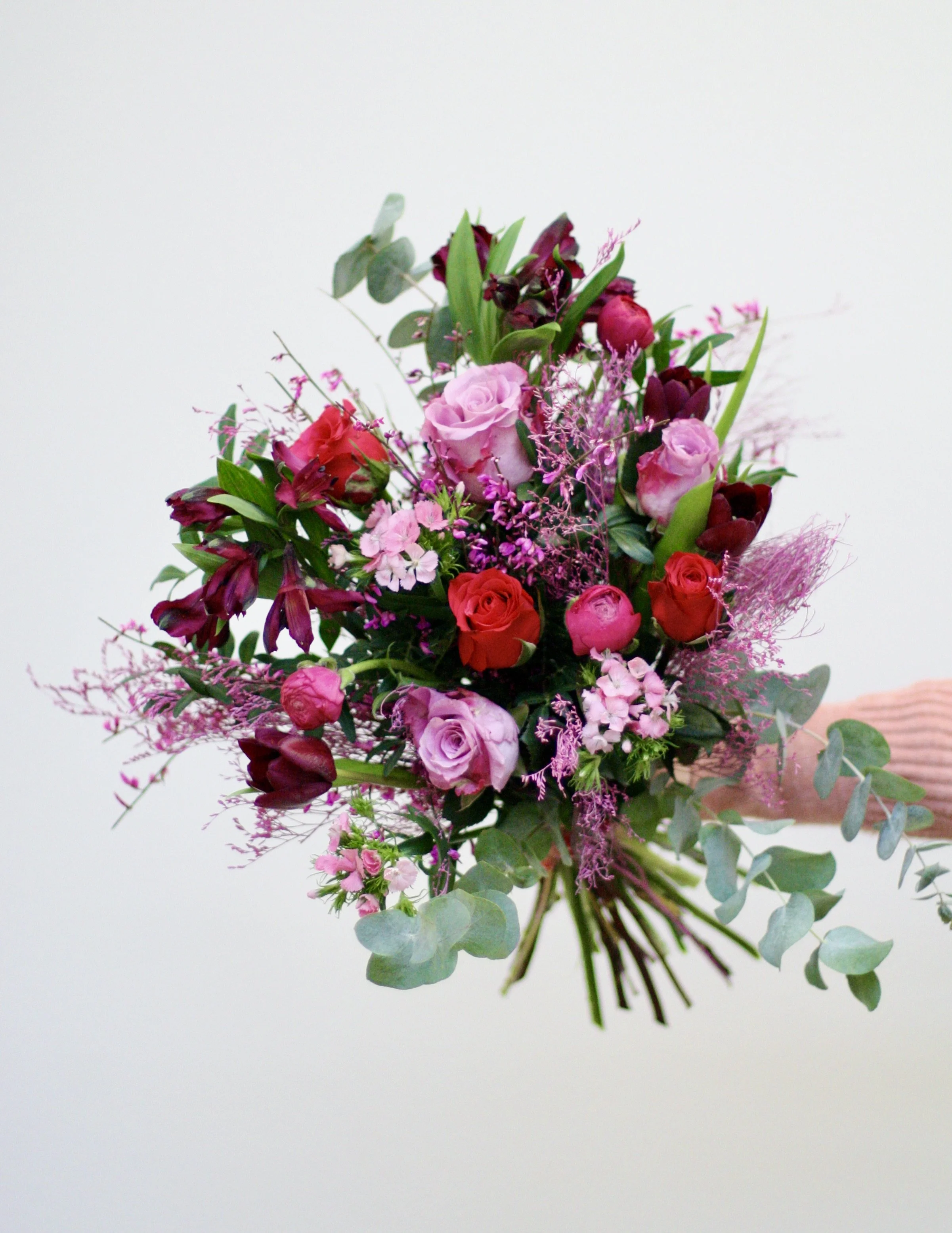 Composition : Rose, renoncules, oeillet, genêt, statice, limonium, scabieuse